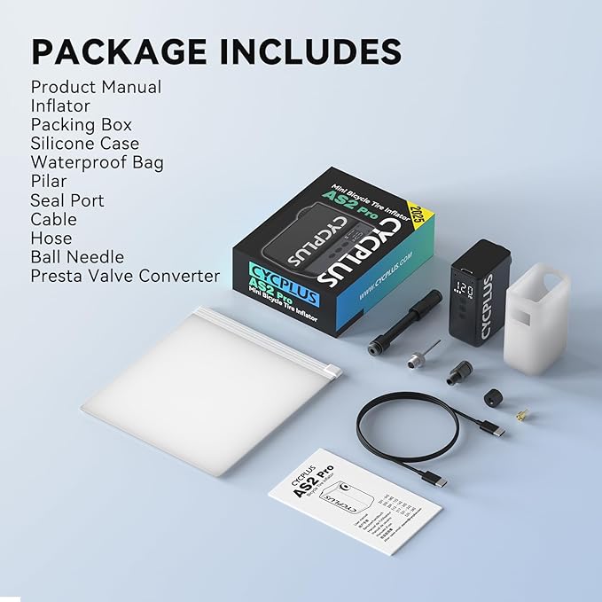 • 【Package List】Tire inflator ✖1, flexible hose ✖1, Presta Valve Adapter ✖1, ball needle ✖1, silicone case ✖1, waterproof storage bag ✖1, USB charging cable ✖1, user manual ✖1