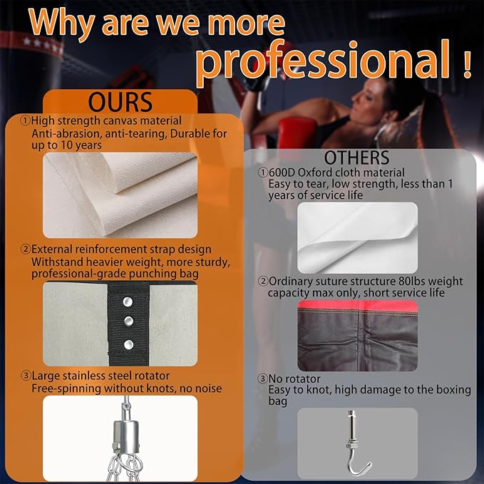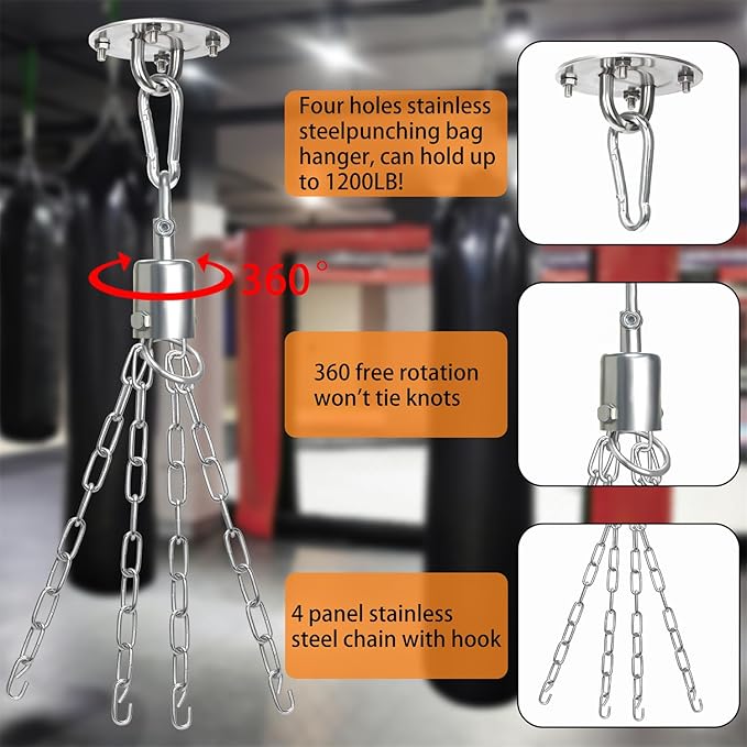 • PUNCH BAG WITH 360° ROTATING HANGER: Swivel Hanger allows the heavy bag/saco-de-boxeo to rotate freely without knotting after impact. The stainless steel material make it can hold up to 1200LB! Hang the bag indoors or your home rooms and start your boxing training