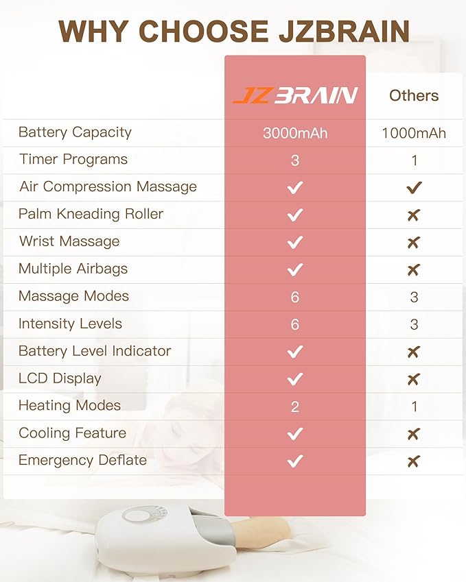 • 【Specialized Air Compression with Adjustable Wrist Support】Unlike traditional models, our independent airbag design applies precise air compression to your hand and wrist, helping reduce strain from repetitive motions and improving circulation. JZBRAIN hand massager size in 9.84 x 6.3 x 3.94 inches, the adjustable wrist strap provides a secure and comfortable fit, making it ideal for office workers, artists, and individuals experiencing wrist discomfort. Experience a gentle yet effective massage that enhances your overall hand relaxation and wellness