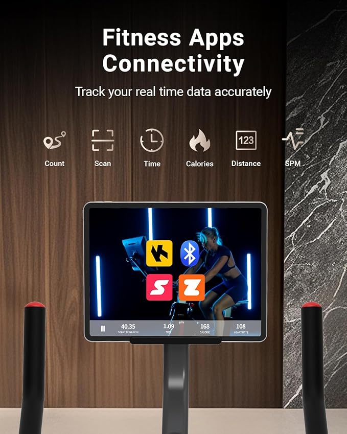 • Exercise Bike Bluetooth: With a built-in sensor,this exercise bikes for home support multiple fitness app,which can track your real-time sports data,such as time,speed,RPM,distance and calorie. These fitness apps offer a variety of exercise courses, enabling you to personalize your workout plan and add entertainment to your fitness routine