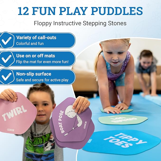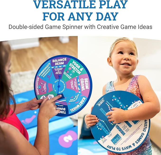 • PERFECT TOOL FOR CREATIVITY: Gibson Engage Gymnastics Games are built with versatility in mind, making this set ideal for promoting imaginative creative play. Crafted from premium materials, the tumbling and gymnastics playset can be set up with mats and beam end-to-end, or with beam between the mats. Colorful graphics inspire "jumping over water", "avoiding the lava", hopscotch, cartwheels, tumbling, and countless configurations with the puddles as stepping stones. Every part of the set, from the two-sided spinner to the puddles and mats, gives suggestions for endless play and exercise.