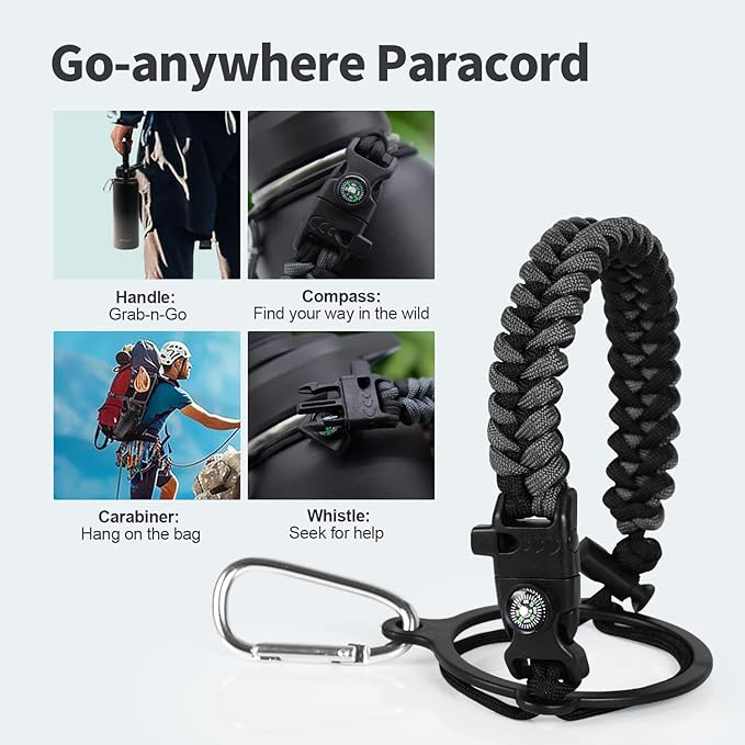 • Palm Fitting Paracord Handle: Compared to handle lids, nylon paracord on the bottle gives you more choices in terms of color coordination and coziness on your hands. Match the handle with your bottle to make a complete outdoorsy look. Compass and carabiner can be lifesavers for hiking and other expeditions