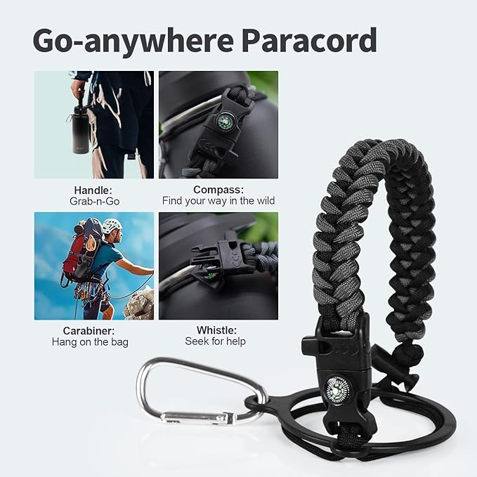 • Palm Fitting Paracord Handle: Compared to handle lids, nylon paracord on the bottle gives you more choices in terms of color coordination and coziness on your hands. Match the handle with your bottle to make a complete outdoorsy look. Compass and carabiner can be lifesavers for hiking and other expeditions