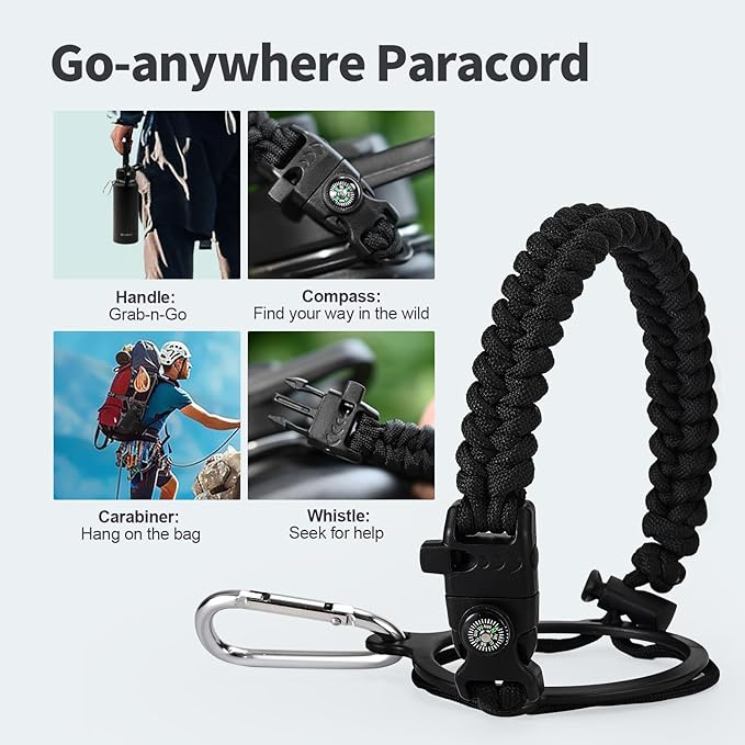 • Palm Fitting Paracord Handle: Compared to handle lids, nylon paracord on the bottle gives you more choices in terms of color coordination and coziness on your hands. Match the handle with your bottle to make a complete outdoorsy look. Compass and carabiner can be lifesavers for hiking and other expeditions