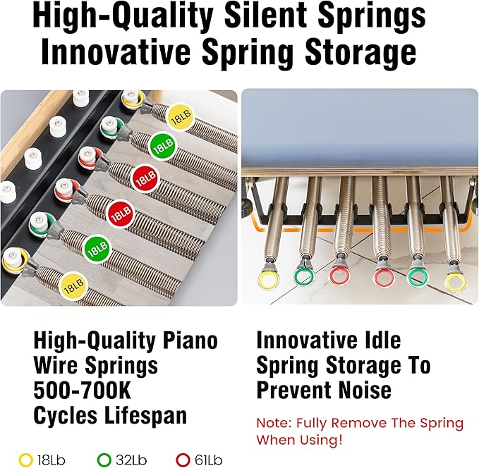 • Precision Resistance with 6 German Steel Springs Equipped with 6 German-engineered steel springs, this reformer provides smooth and customizable resistance. From core strengthening to flexibility training, the adjustable springs offer a personalized experience for all fitness levels, ensuring safe and effective workouts.