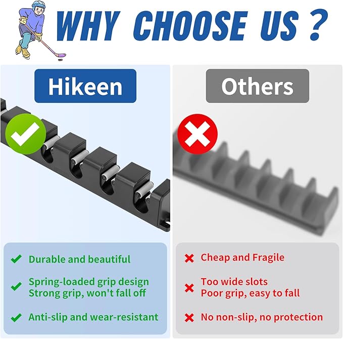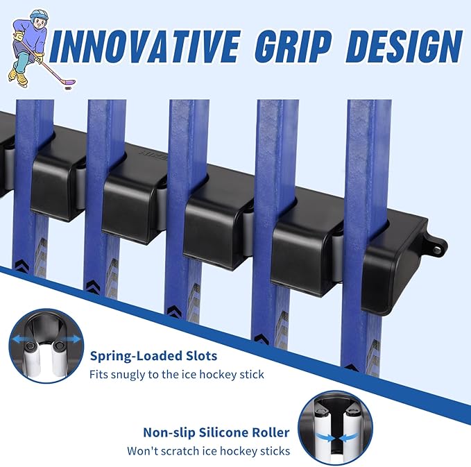 • [SECURE - STABLE CLAMPING] Hikeen Hockey stick wall mount features unique spring loaded grooved rollers and non-slip rubber construction for strong clamping force and non-slip function to securely hold your hockey stick, unlike other grooves on the market that are too wide and easy to fall off. Say goodbye to the worry of hockey stick slipping and damage, safely protect your valuable hockey stick.