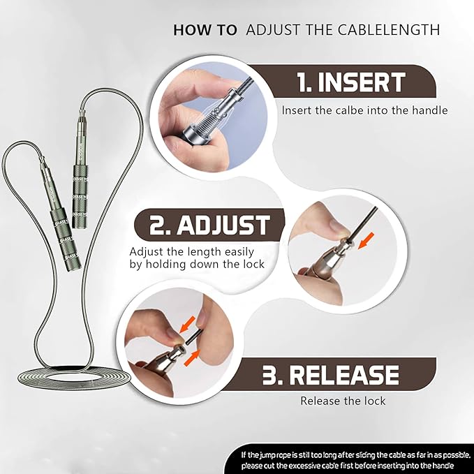• 【Self-Locking and Screw-Free】The design of self-locking and screw-free make the fitness jump rope easy to adjust the length without cutting with pliers and locking with screws, only need to press the handle end to insert or take out the cable. The maximum adjustable length of this skipping rope up to 14 inches by trim, perfect for kids, women and men rope skipping.