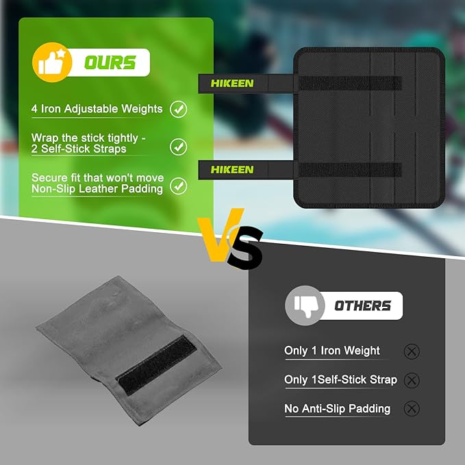 • [ FIRM FIT ] The pro hockey stick weight comes with two 7in. heavy-duty self-stick straps that easily fit around the end of your hockey stick. Even when swinging a hockey stick vigorously, the weights wrap securely and tightly around the stick so the weights won't fall off during practice.