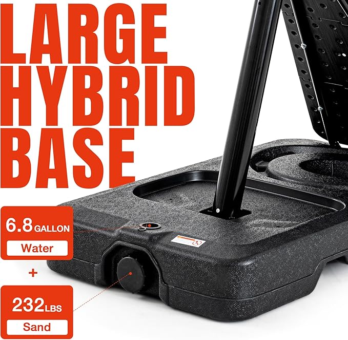 • 【Unmatched Durability and Stability】: This basketball system is built to last with a robust base that can accommodate up to 232 pounds of sand plus 6.8 gallon water, ensuring exceptional stability. The enhanced 50 inch backboard provides an optimal playing experience. Designed with waterproof poles, it can withstand various outdoor weather conditions, guaranteeing long-lasting performance and durability.