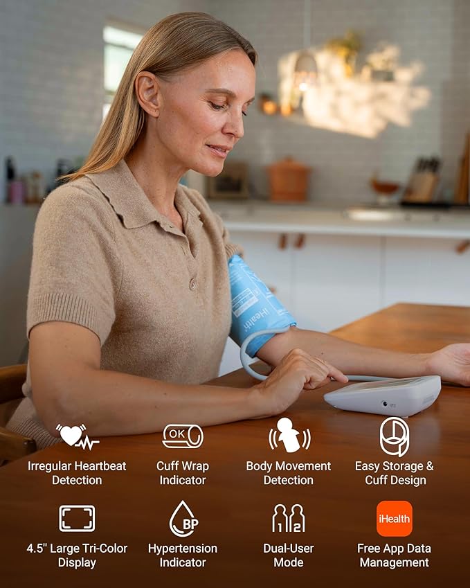 • Smart and Accurate Home Blood Pressure Monitoring: The iHealth Home Smart Blood Pressure Monitor delivers medical-grade accuracy with a cuff wrap indicator that ensures a perfect fit from the start. Additionally, advanced motion detection ensures reliable results during the measurement process. These features provide clinically accurate readings at home, making monitoring simple and effective without the need for doctor assistance.