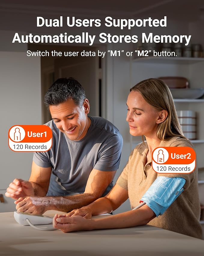 • Bluetooth Blood Pressure Monitor: Sync effortlessly with the free iHealth MyVitals app (ensure your app is up to date) on iOS or Android. Designed for two users, each can store up to 120 readings with unlimited cloud storage. The app automatically generates trend charts for blood pressure and heart rate, making it easy to share reports with your doctor anytime. Whether tracking your own or your parent’s health, iHealth makes monitoring simple.