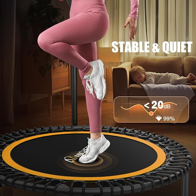 • Quiet 45dB Bungee Technology: our bungee system is lab-tested to be 43% quieter than loud spring trampolines (45dB vs 80dB). That's softer than normal conversation! Perfect for apartment workouts anytime - even at night. Meets all residential noise rules