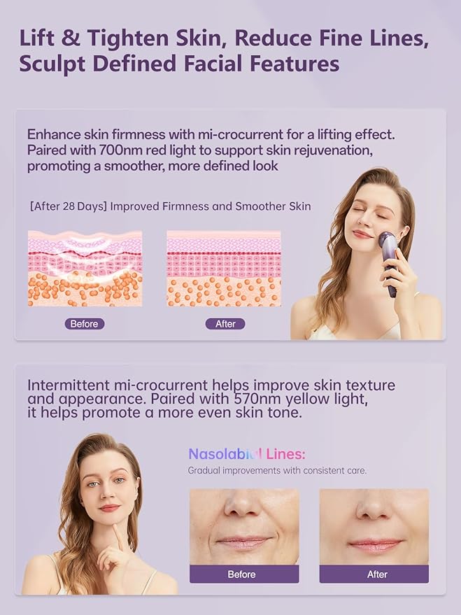 • 6-in-1 Multifunctional Facial Device for Instant Lift & Long-Lasting Firmness: Achieve spa-quality results at home with this all-in-one device. It combines microcurrent, ion cleansing & infusion, vibration, heating, cooling, and 5-color LED light therapy to tighten skin, reduce wrinkles, deeply cleanse, enhance skincare absorption. Experience instant lifting & long-lasting firmness, revealing smoother, firmer, more youthful skin. Ideal for daily use to maintain a vibrant, youthful complexion