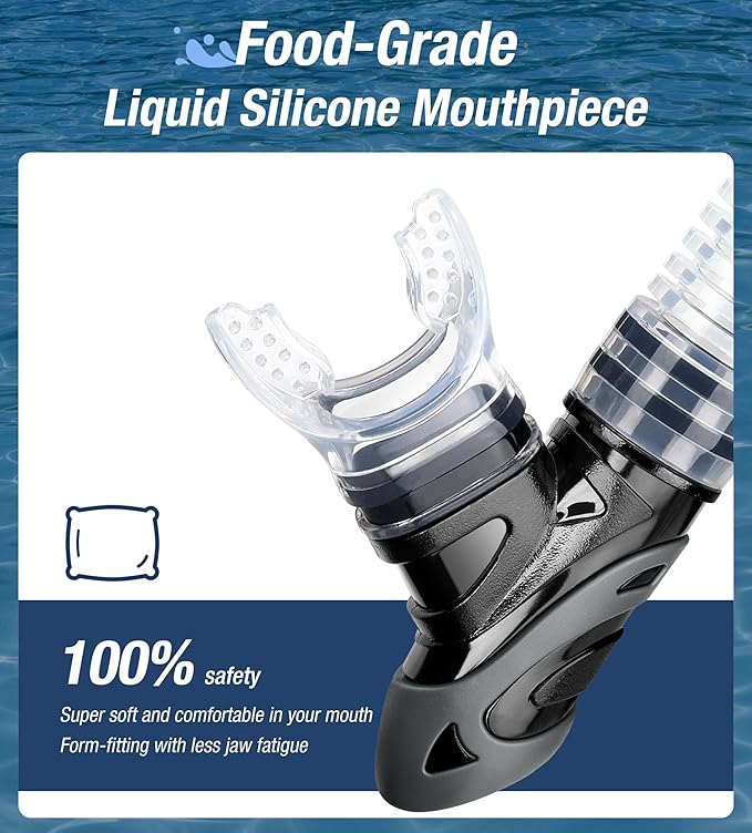 • Advanced top dry valve and splash guard: Aegend Dry snorkel profiled “paddle” dry top automatically closes when submerged, not allowing water entry. Even waves crash overhead, the splash-guard will prevent water from coming into the snorkel. Unlike the float ball valve which gets lodged easily by small sands or kinds of stuff, our new design valve won't be stuck, which give you comfortably breath.