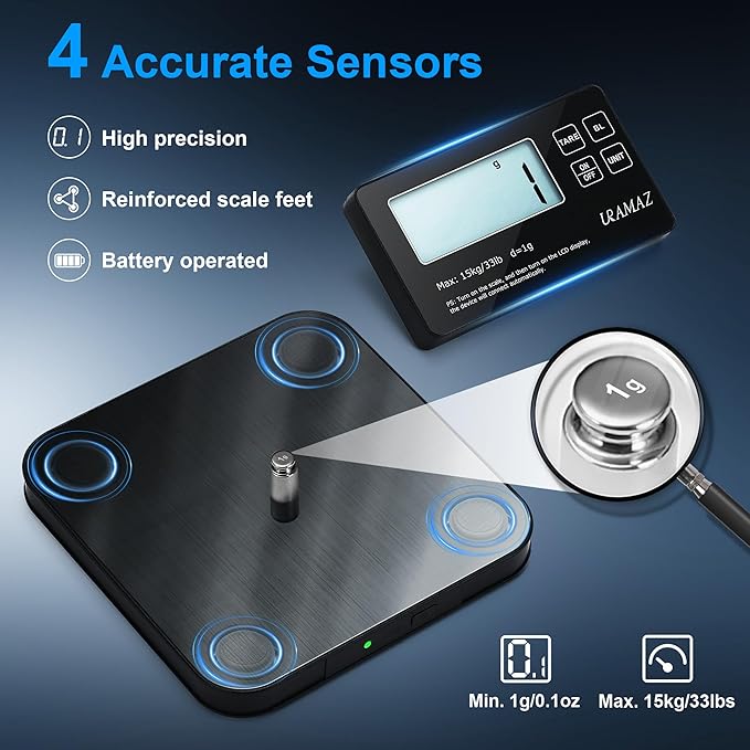 • 【304 Food-grade Stainless Steel】 The weighing pan is crafted from 304 food-grade stainless steel, ensuring safety, durability, and easy cleaning. Regarding the Bluetooth connection distance between the scale pan and the display, the longest distance is about 5 meters if connected through a wall, and about 10-15 meters without a wall. (Ensure to peel off the blue protective film from the scale before using it.)