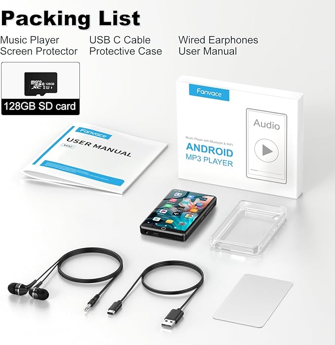 • 【Package Included】1 x MP3 Player, 1 x 128GB SD Card, 1 x USB C Cable, 1 x Wired Earphones, 1 x Screen Protector, 1 x Protective Case, 1 x User Manual; Our MP3 player with bluetooth provide 12 hours of customer service. Please contact us if you have any problem during your use, we will solve it for you within 12 hours. ---Noted: FAT32 format MicroSD card support ONLY!