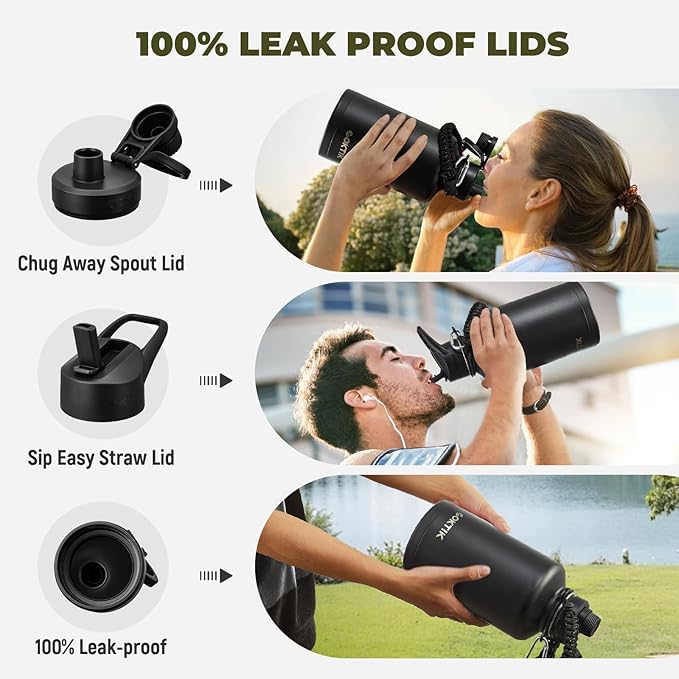 Half Gallon Insulated Water Bottle, 64 oz Triple Wall Stainless Steel Flask, Keeps Drinks Cold for 48 Hrs Leak-Proof & BPA-Free Half Gallon Jug with Paracord Handle, Straw & Spout Lids(2 pack,Black)