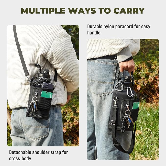 • Iconic Paracord Handle and Carrying Pouch: This insulated water bottle comes with a beautiful hand knit nylon paracord in coordinated color with the water bottle. This paracord handle is a must-have as a full functional camping / hiking flask. And storage carrying pouch with removable shoulder strap for convenient hands free carrying! The safe zippered pocket design to stores all your stuff, holds your cards & phone & key