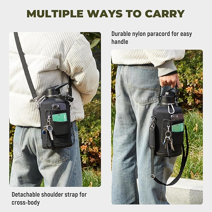 • Iconic Paracord Handle and Carrying Pouch: This insulated water bottle comes with a beautiful hand knit nylon paracord in coordinated color with the water bottle. This paracord handle is a must-have as a full functional camping / hiking flask. And storage carrying pouch with removable shoulder strap for convenient hands free carrying! The safe zippered pocket design to stores all your stuff, holds your cards & phone & key