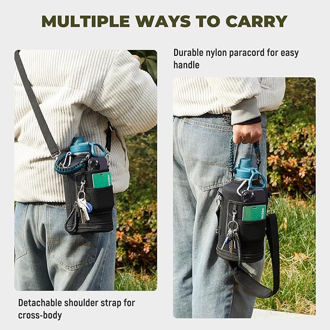 • Iconic Paracord Handle and Carrying Pouch: This insulated water bottle comes with a beautiful hand knit nylon paracord in coordinated color with the water bottle. This paracord handle is a must-have as a full functional camping / hiking flask. And storage carrying pouch with removable shoulder strap for convenient hands free carrying! The safe zippered pocket design to stores all your stuff, holds your cards & phone & key