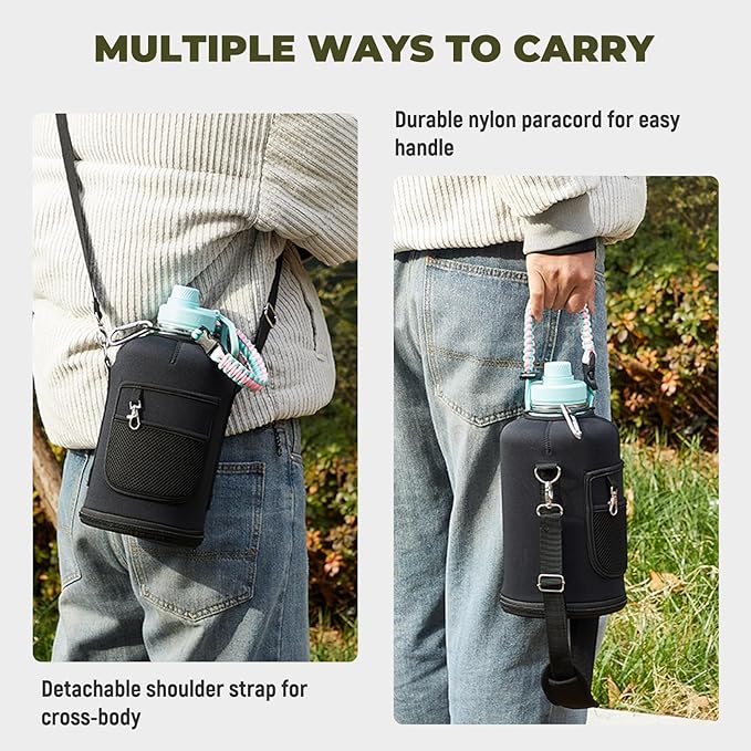 • What You'll Get: Buy a half gallon insulated water bottle, get 9 accessories (Carrying Pouch, Straw Lid with 2 Straws & Straw Brush, Spout Lid, Paracord Handle, Bottle Brush). We offer Continuous After-sales Service and 100% customer satisfaction against any leakage or insulation failure