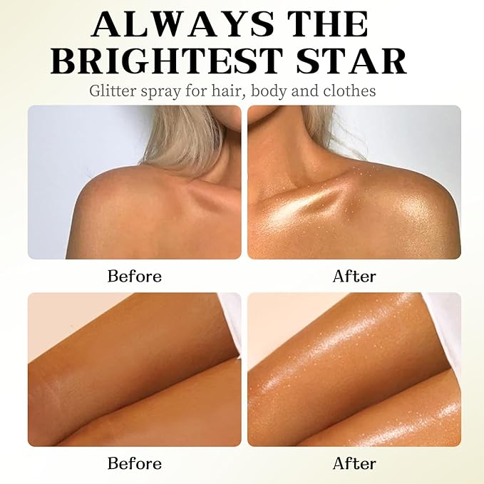 • Multi-Purpose Glitter Spray: Our body glitter spray is made of glitter particles, delivering a charming shimmer effect. You can spray it on your body, hair, face, skin, and even clothes. It will make you the center of attention under the lights at parties or nightclubs