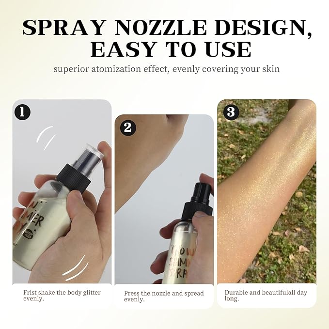 • Long-lasting: Body shimmer spray typically has long-lasting, and quick-drying effects. The tiny particles formed on the skin can remain on the skin surface for a long time, making your skin look radiant all day long. No need for frequent touch-ups, keeping you shining all the time