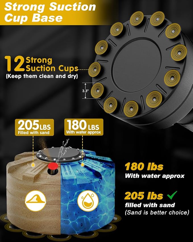 • Stable Floor Sucking Base - Rounded ABS tank base for easy rolling relocation. Includes 12 strong suction cups beneath to stop base movement. Filled with sand or water, sand proves more stable.