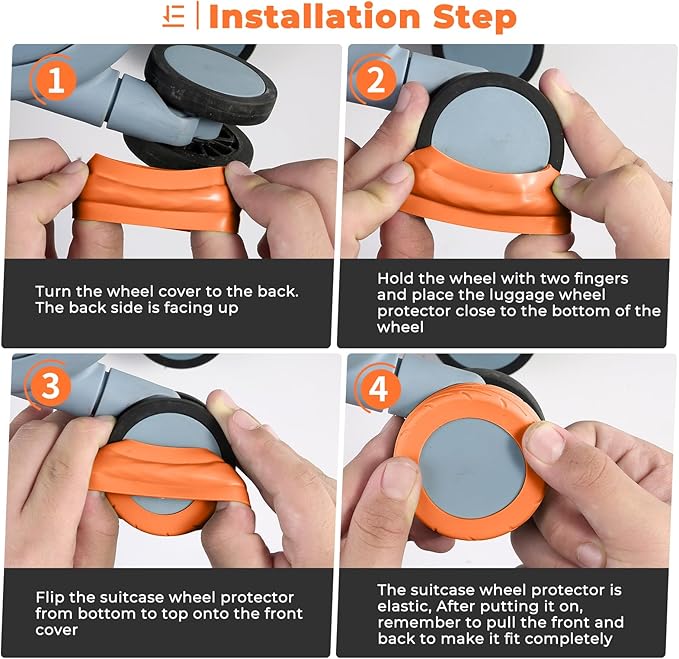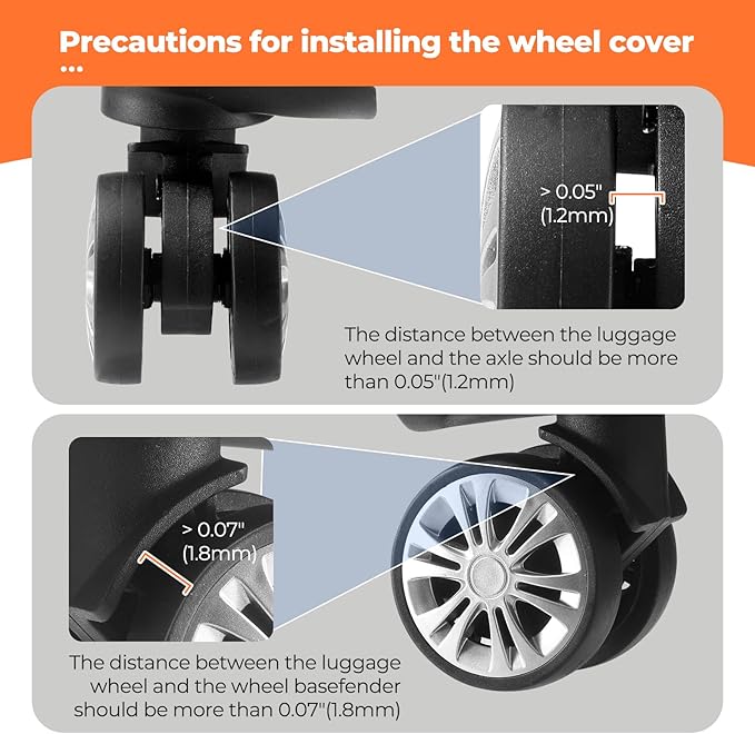 • [Fits Most Suitcases] These suitcase covers for luggage wheel are suitable for suitcases with wheel diameter between 2.0-2.4"(50-60mm),the distance between the luggage wheel and wheel base fender should be more than 0.07"(1.8mm),and the distance between the luggage wheel and axle should be more than 0.05"(1.2mm) ,This Suitcase wheel cover for luggage Suitable for 4x2 double wheels, not suitable for 4x1 single wheels luggage