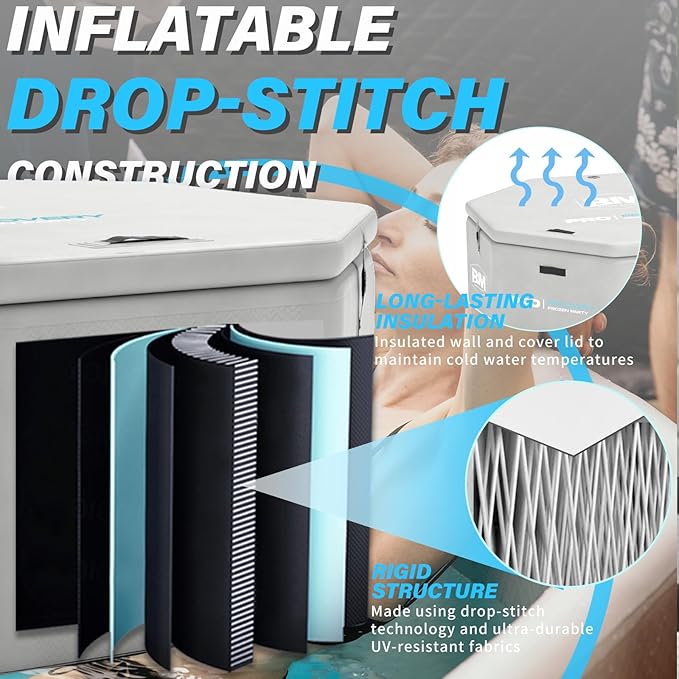 • Durable and Long-Lasting Construction: Crafted from puncture-resistant drop stitch, the ice plunge is built to withstand frequent use and harsh outdoor conditions. The durable material ensures that the tub remains intact and performs well for years, even under high-pressure or extreme temperatures. The high-density insulation and strong seams add to its durability, making it a reliable and long-lasting investment for your wellness routine