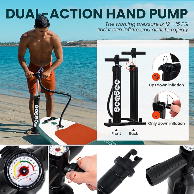 • 【SUP Accessories】 Floating paddle , double action hand pump with psi gauge, 3 removable fins, safety leash, SUP manual, repair kit and a backpack. Just put all in your backpack and you've got everything you need to hit the water.