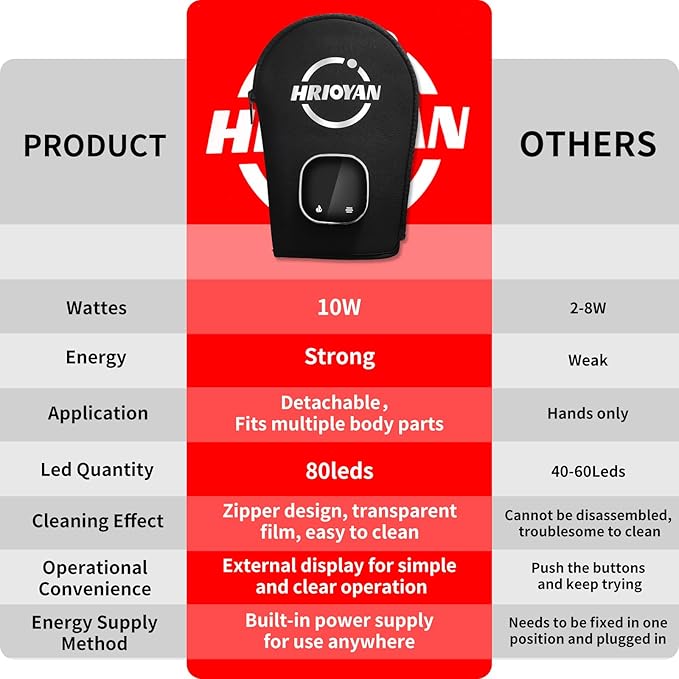 • PROFESSIONAL LED LIGHT THERAPY: The Hrioyan red light therapy glove contain 80 LED beads, each consisting of 660 nm red light and 850 nm near infrared light. 660 nm red light (visible light) can penetrate the skin epidermis, promote cell metabolism and repair damaged skin; 850 nm infrared light (invisible light) penetrates deeper than the red light, and can have a thermal effect on muscles and accelerate blood circulation. produce thermal effect, accelerate blood circulation, relieve pain and relax muscle tension