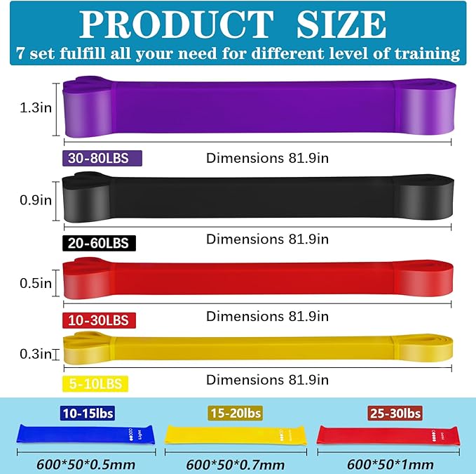 • 【7-Piece Set for Full-Body Toning】This set includes 4 long pull-up assistance bands (Yellow 5-10 lbs, Red 10-30 lbs, Black 20-60 lbs, Purple 30-80 lbs) and 3 resistance loops (Blue 15 lbs, Yellow 20 lbs, Red 30 lbs). Perfectly designed for low-impact yet effective exercises that target arms, abs, glutes, and thighs, helping you achieve a leaner, more toned body