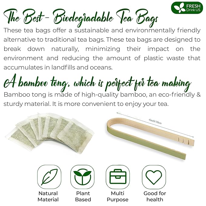 • ☘️ BIODEGRADABLE TEA BAG - NATURAL MATERIAL: The tea bags are made of natural corn fiber, which is friendly and nice for the environment. No Strings. No Wrapped. No Staples. No Adhesive. No Bleach. No Dyes - 100% Safety.