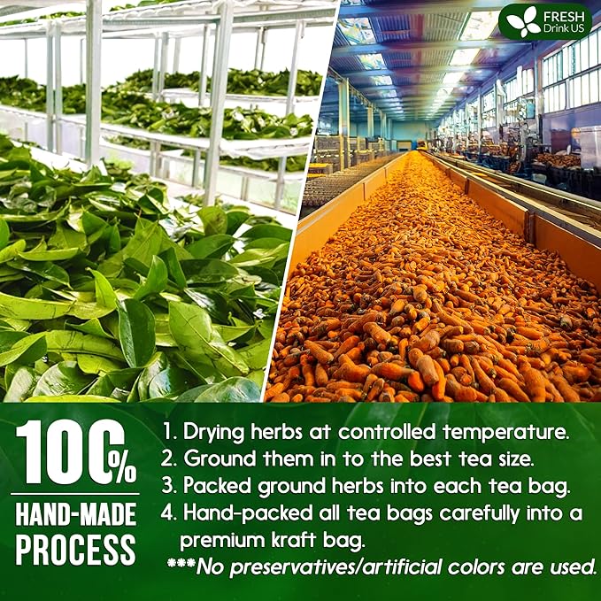 • ☘️ SOURSOP TURMERIC TEA BAGS MADE BY A HAND-MADE PROCESS: Soursop Leaves and Turmeric are picked at their flavorful/colorful peak and naturally sun-dried and roasted to perfection. We hand-select only the premium herbs for the utmost quality. Then we grind them into the best tea size. Next, we immediately pack it in eco-friendly tea bags. Lastly, we pack the tea bags into food-grade kraft bags for ultimate freshness.