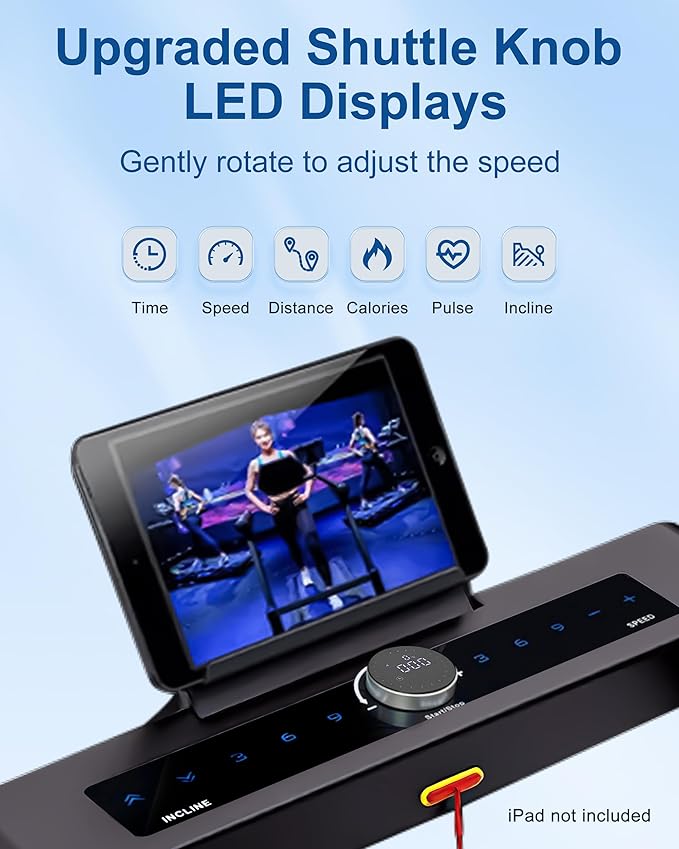 • Advanced Console with Bluetooth Integration: The LED knob display shows real-time workout data, while the touch console allows quick speed and incline adjustments. Connect the Bluetooth app to track progress and enjoy music through built-in speakers for an enhanced workout experience.