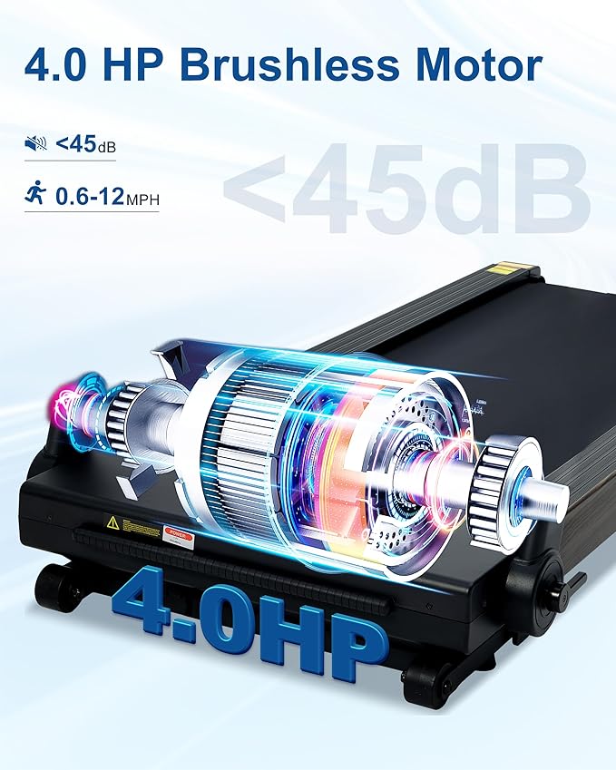 • 4.0HP Brushless Motor & 20% Auto Incline: The brushless motor ensures faster, quieter, and smoother operation, extending the treadmill's lifespan. It supports speeds from 0.6 to 12 mph and features a 20% auto incline (up to 5.2 degrees) for a more challenging workout.