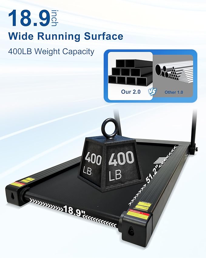 • 400 LB Capacity & 18.9 INCH Wide Belt: This heavy duty treadmill features a sturdy frame supporting up to 400 lbs. The 51" x 18.9" running surface provides ample space for various activities, ensuring comfort and stability for users of all sizes.