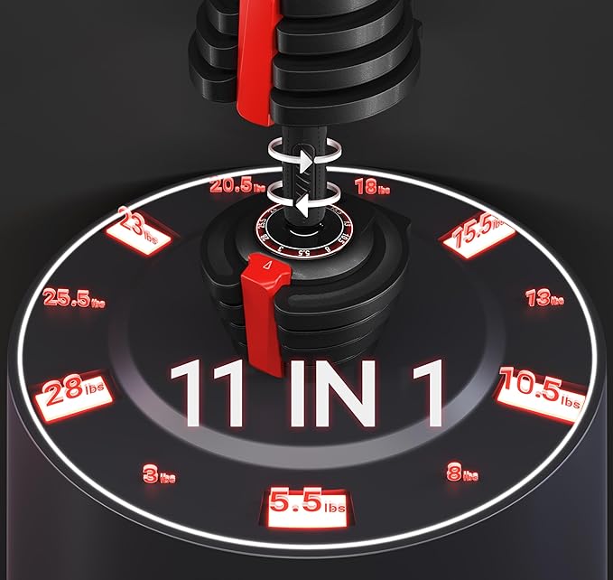 • 1-SED ADJUSTMENT FEATURE:With just a quick grip, twist, and lift of the selectorized anti-slip handle, you can easily switch the 11 adjustable weight dumbbells settings in just one second. The hassle-free customization is aided by clear dials that ensure easy readability