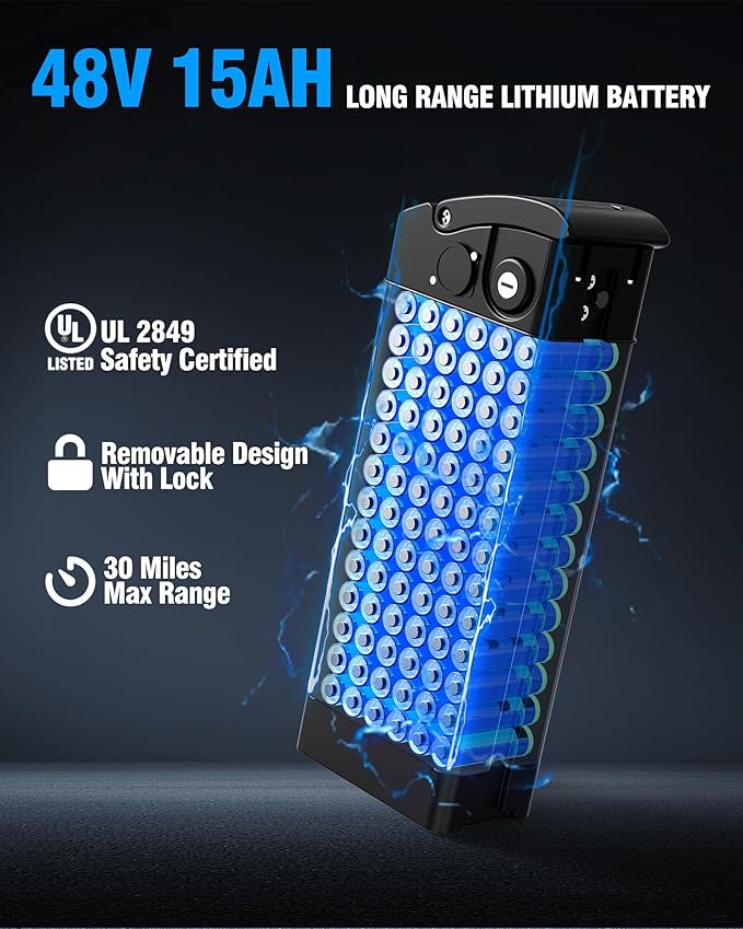 • HIGH CAPACITY BATTERY- 48V 15AH ebike battery with 2A fast charger can be quickly recharged in 3 hours, providing you with up to 30-45km of power for your ride (pedal assist mode)