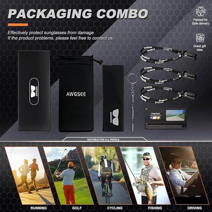 • USE OCCASIONS ► AWGSEE polarized sunglasses help reduce glare and provide extra clarity while keeping your eyes protected. Is ideal for usage by motorcycle and cycling, driving, running, fishing, climbing, golf, trekking or other outdoor activity enthusiasts.
