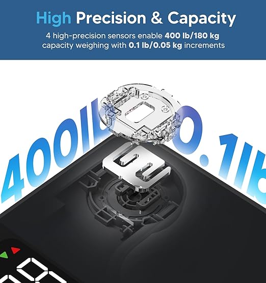• Precision Measurement & Safety Design: Our scale body weight delivers 0.1 lb/0.05 kg accuracy and supports weights up to 400 lb/180 kg, ensuring consistent results across all body measurements. Complementing its technical performance, the 5mm tempered glass platform and anti-slip textured surface provide enhanced stability and safety for users of all ages and fitness levels, from adults to athletes