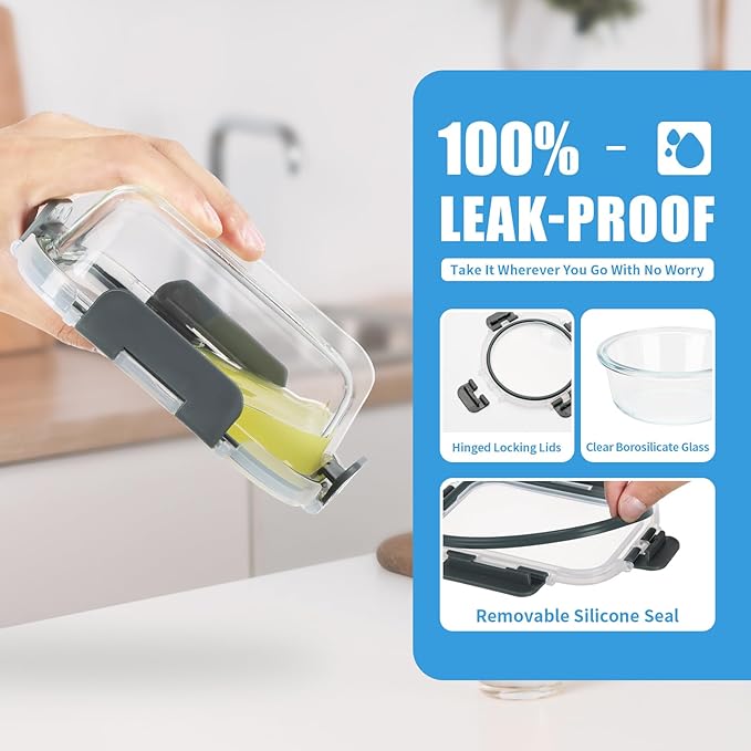 • 【100% Leak Proof Airtight Lid】Glass food containers is designed with removable silicone seals and 4-hinge snap locks to ensure zero leaking or spilling, which also prevent smell go out and keep food fresh.