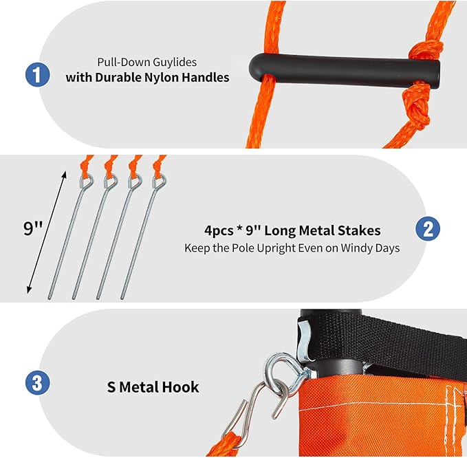 • 𝐒𝐓𝐔𝐑𝐃𝐘 𝐒𝐓𝐑𝐔𝐂𝐓𝐔𝐑𝐄: Supported by strong powder-coated steel poles measured 32mm in diameter, more resistant to chipping, scratching and fading, strong enough to offer maximum stability; While Set up with Heavy Duty PE Guide Rope with adjuster and 9" long ground anchors can hold the poles firmly and provide extra stability!
