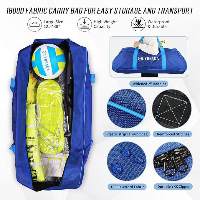 • 𝐀𝐥𝐥 - 𝐈𝐧 - 𝐎𝐧𝐞 𝐏𝐫𝐨 - 𝐆𝐫𝐚𝐝𝐞 𝐀𝐜𝐜𝐞𝐬𝐬𝐨𝐫𝐲 𝐏𝐚𝐜𝐤𝐚𝐠𝐞:This set is your ticket to instant volleyball action. It includes a soft PU volleyball with a large pump (for quick inflation), heavy - duty 12” long (9mm diameter) stakes + 4 guide ropes, high - visibility 60FT boundary lines & scoring marks, and strong climbing carabiners. The 1800D Oxford carry bag (YKK zipper, widened 2” handles) fits all components – even an inflated ball – for easy storage and transport.