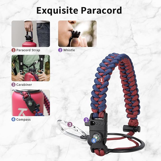 • Full-function Paracord Handle: Brilliant paracord of matching colors bring out the bottle with a touch of youthful vibe. Compact compass and handy carabiner make the bottle the ideal survival kit for expeditions in the wild.