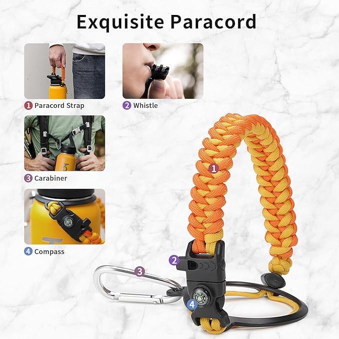 • Full-function Paracord Handle: 32 ounce water bottle come with paracord handle the brilliant paracord of matching colors bring out the bottle with a touch of youthful vibe. Compact compass and handy carabiner make the bottle the ideal survival kit for expeditions in the wild.