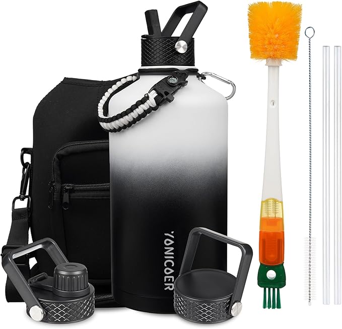 • What you get: We provide continuous after-sales service and 100% customer satisfaction to prevent any leakage or bonding failure. Your purchase includes: YONICOER water bottle, 3 lids, paracord handle, 1 brush, 2 straws, 1 straw brush, 1 cup sleeve