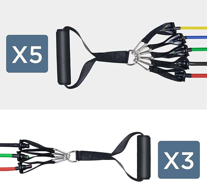 • What's Included: 5 durable TPE bands, 2 cushioned handles, 2 ankle straps, 1 carrying bag, and 1 exercise guide