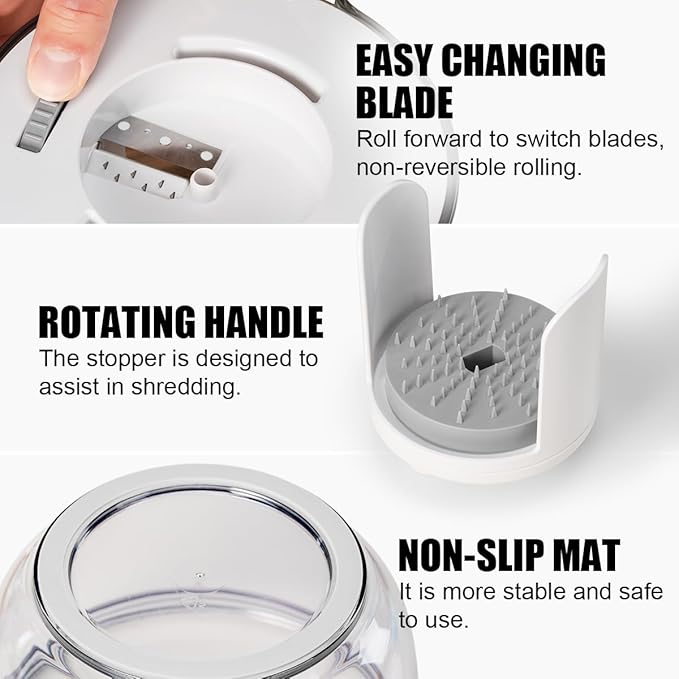 • One-Wheel Blade Selector: Innovative unidirectional wheeln of the zucchini spiralizer seamlessly cycles through 3 blades without disassembly. Simply rotate the textured dial (clockwise only) to click between 0.2" fine shredding, 0.3" shredding, and 1.4" flat cuts. Safety lock prevents accidental blade changes during use.
